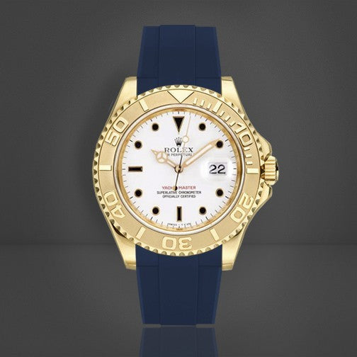 Vulcanized rubber strap which is precisely calibrated to fit the case of Rolex Yachtmaster 35mm case (17mm Lug Space ONLY). This strap utilizes "Blocked Integration" engineering, incorporating solid inserts for a flawless, motionless flush mount to the Yachtmaster 35mm case*.