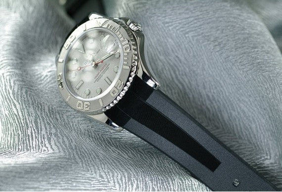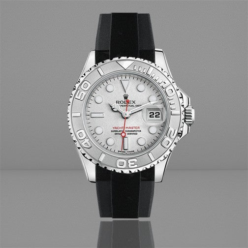 Vulcanized rubber strap which is precisely calibrated to fit the case of Rolex Yachtmaster 35mm case (17mm Lug Space ONLY). This strap utilizes "Blocked Integration" engineering, incorporating solid inserts for a flawless, motionless flush mount to the Yachtmaster 35mm case*.
