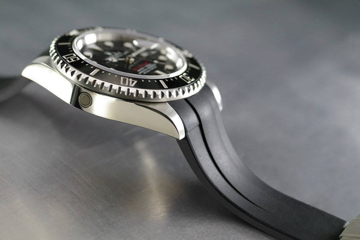Carbon Fiber Series rubber strap engineered to fit Rolex Sea-Dweller 43mm case and Glidelock clasp (NOTE: not compatible with 40mm Sea-Dweller or 44mm Deepsea Sea-Dweller models). This strap utilizes "Blocked Integration" engineering, incorporating solid inserts for a flawless, motionless flush mount to the watch case.