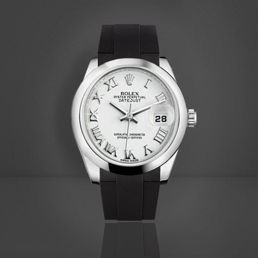 Vulcanized rubber strap which is precisely calibrated to fit the case and clasp of Rolex Oyster Perpetual 31mm (16mm lug space ONLY) and Datejust 31 (16mm Lug Space ONLY). This strap utilizes "Blocked Integration" engineering, incorporating solid inserts for a flawless, motionless flush mount to the watch case. NOTE: This strap is NOT compatible with "Day-Date" titled models.