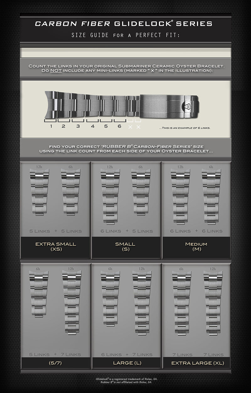Our exclusive STRENGTH INFUSION TECHNOLOGY provides upgraded support against the friction, weight, and frequent micro-adjustments made daily to your Rolex Glidelock Clasp. Carbon Fiber molecules are fused within the vulcanized rubber during its mould process. RESULT: substantial increase in vertical and lateral stress resistance, while maintaing supple, flexible comfort around the wearer's wrist.