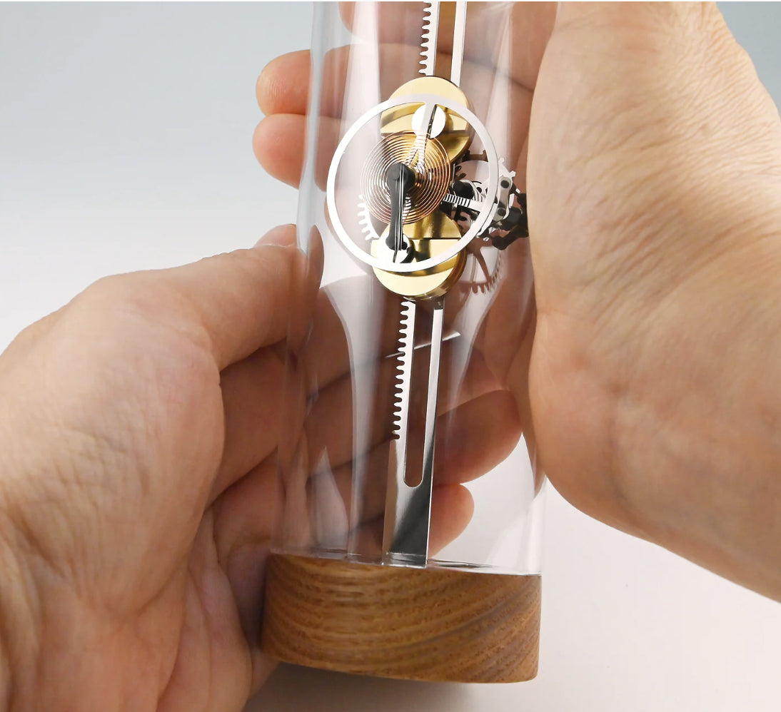 Cet appareil unique permet non seulement de mesurer le temps, mais aussi de ressentir son écoulement à travers le mouvement, le son et les vibrations, tel un léger battement de cœur. De plus, son design minimaliste permet d'apprécier la beauté de la construction mécanique de l'horloge, visible sous différents angles à 360 degrés. Dès que vous en avez l'occasion, observez attentivement la série de mouvements, magnifiquement liés par la coordination de chaque composant. Prenez-la ensuite et retournez-la pour ressentir le rythme complexe du tic-tac, proche des battements de cœur d'un être vivant.